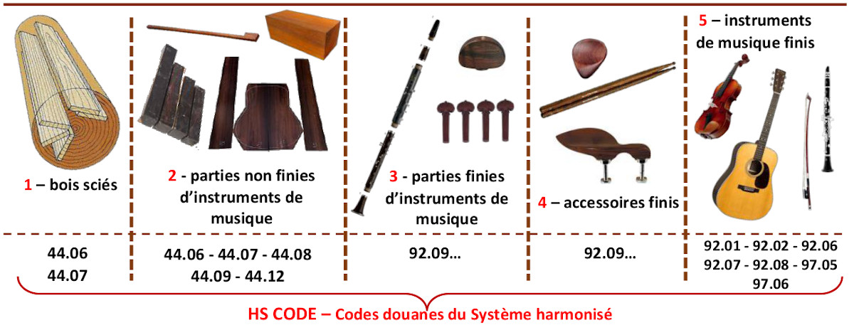 Le commerce de tous les bois bruts, semi-finis et parties non finies des espèces utilisées dans la fabrication d'un instrument de musique et qui sont inscrites aux annexes de la CITES, nécessite des permis.
